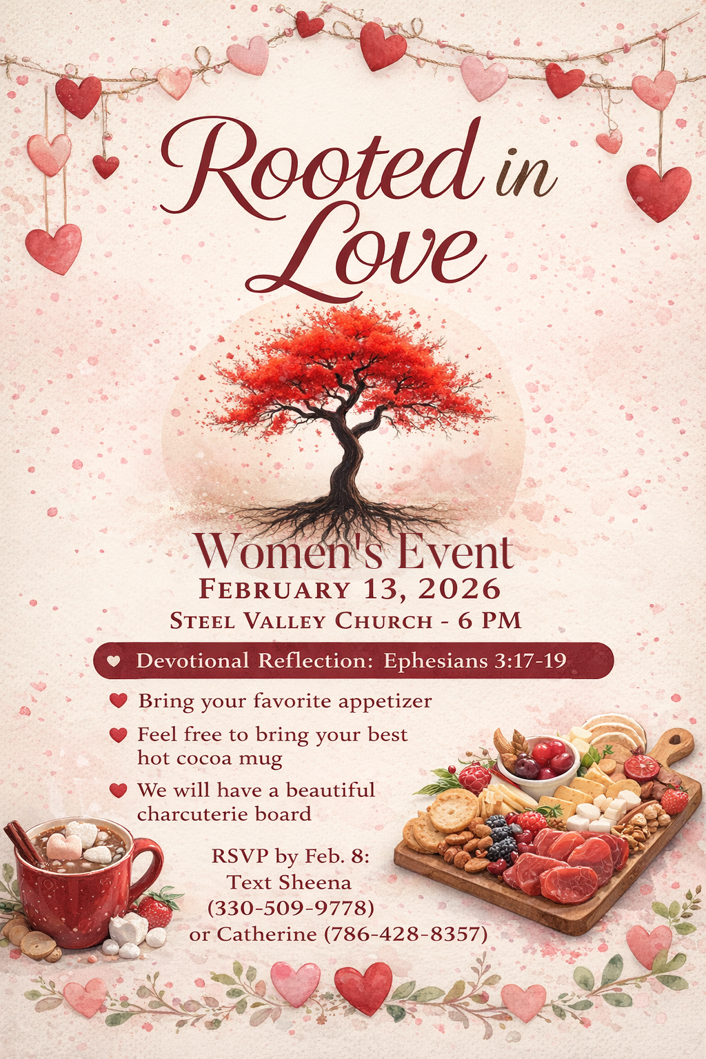 We will be having a Valentine's gathering for the women. Come enjoy a sweet evening of worship, fellowship, and encouragement. As we reflect in the passage of Ephesians 3:17-19 "Rooted in Love." Bring your favorite appetizer! RSVP by Feb. 8, 2026 through sign-up sheet or Text Sheena (330-509-9778) or Catherine (786-428-8357)